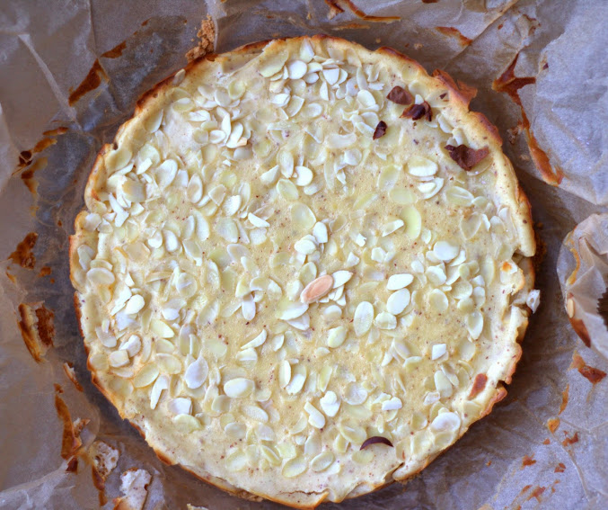 Ciasto wyłożyć do blachy (dno blachy wyłożyć papierem do pieczenia). Ciasto piekłam w tortownicy o średnicy 20 cm.